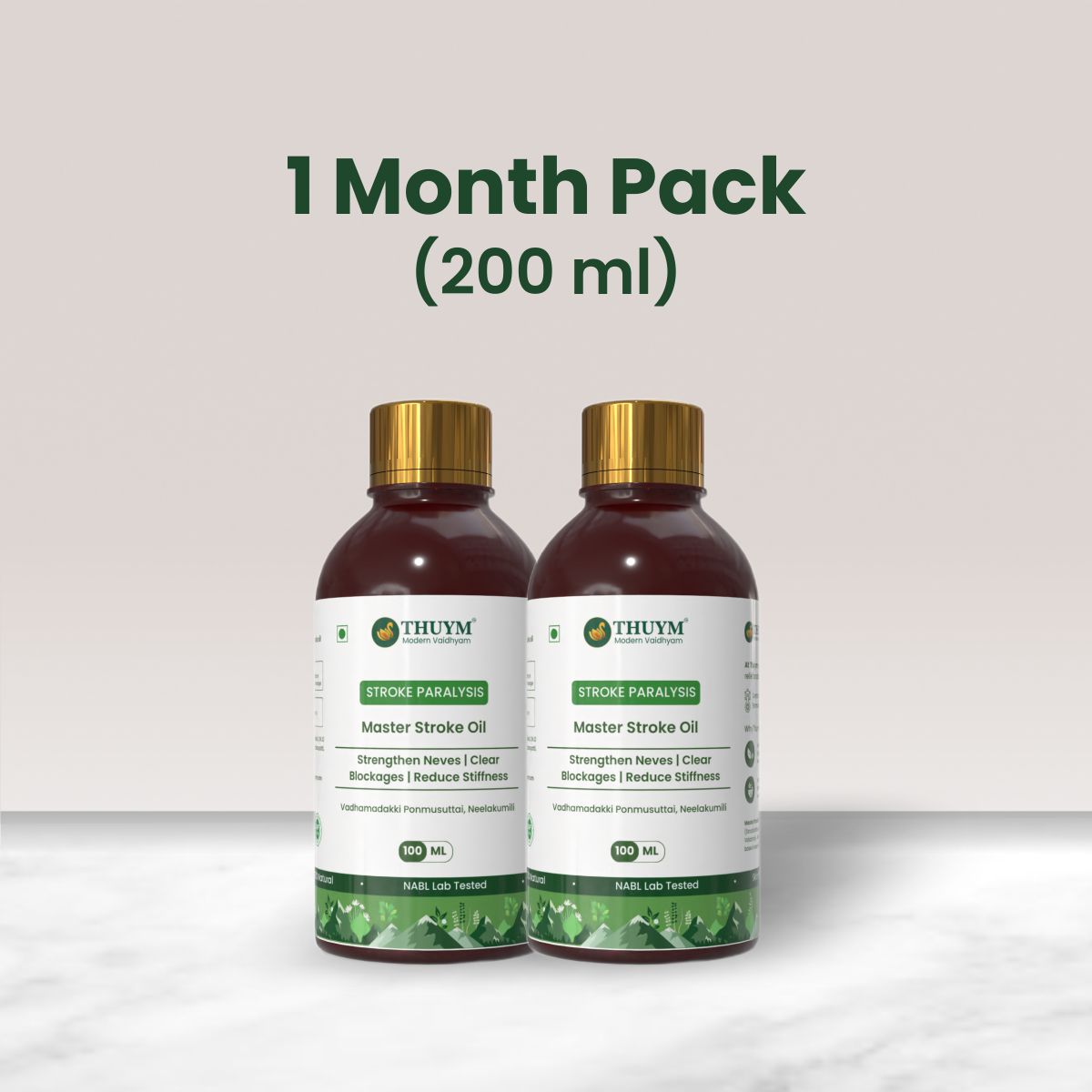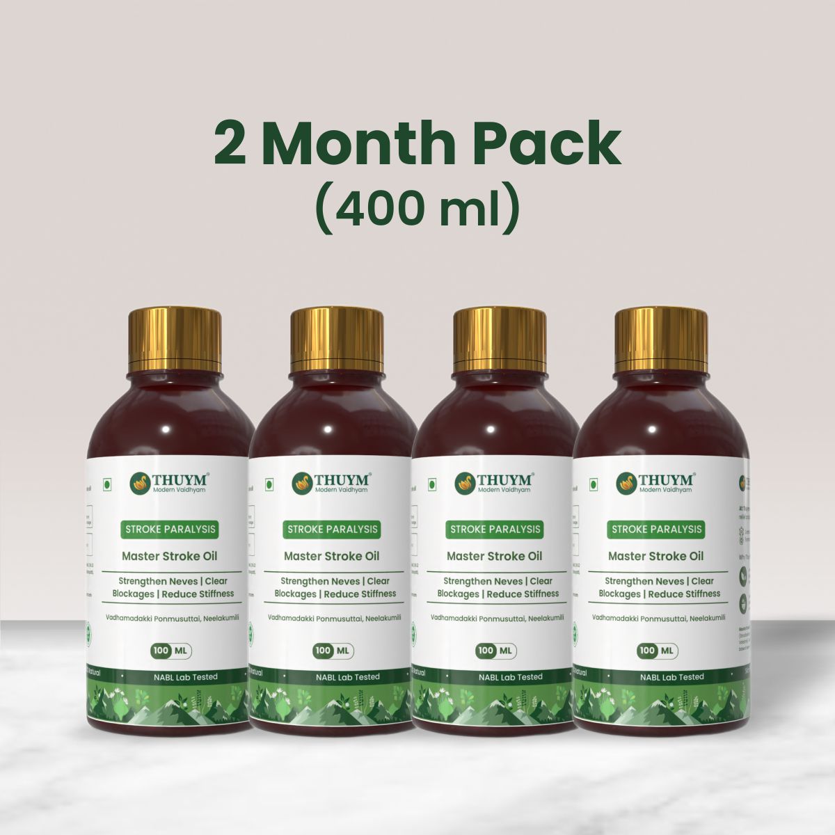 Use Master Stroke Oil 4-5 times daily on paralyzed areas. Heat the oil gently using the double boiler method (placing the oil container in boiling water). Avoid heating the oil directly. Massage the mildly warm oil into the paralyzed areas.